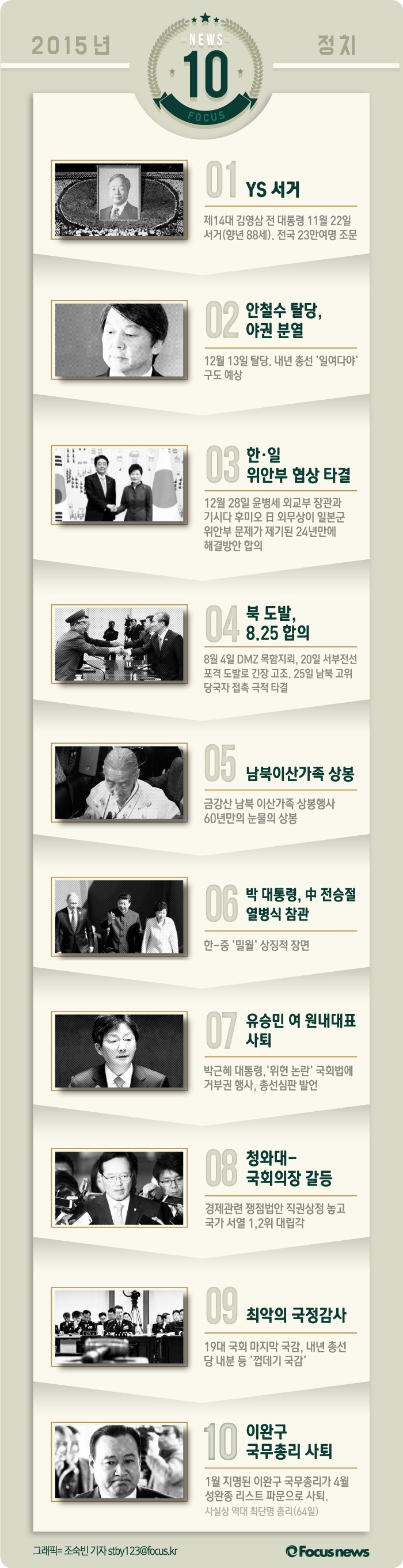 (서울=포커스뉴스) "닭의 목을 비틀어도 새벽은 온다"고 외쳤던 김영삼 전 대통령이 "정치는 살아움직이는 생물"이라는 말을 자주 했던 김대중 전 대통령 곁으로 갔다. 3김(金) 중 남은 김종필 전 총리는 "정치는 허업(虛業)"이라고 말한다. 허허(虛虛)했던 2015년 정치의 10대 뉴스를 선정하며 2016년 새해 '실실'(實實)한 정치를 간절히 기원한다.