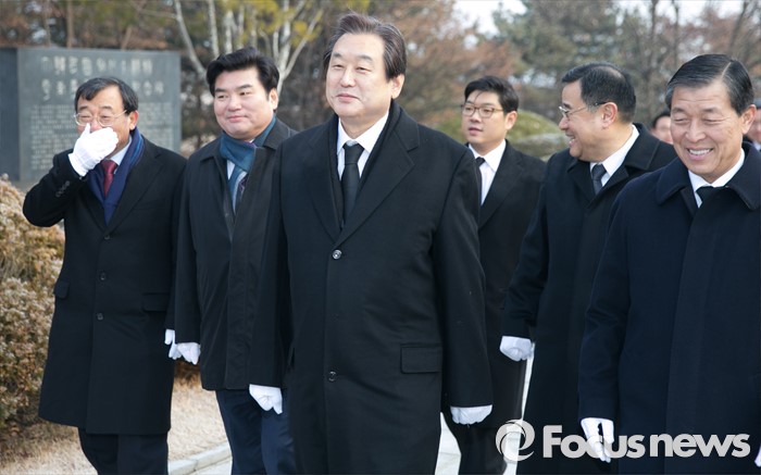 (서울=포커스뉴스) 병신년(丙申年) 새해 첫 날인 1일 오전 동작구 국립서울현충원에서 김무성 새누리당 대표 등 지도부가 이승만 전 대통령 묘역 참배를 위해 이동하고 있다.