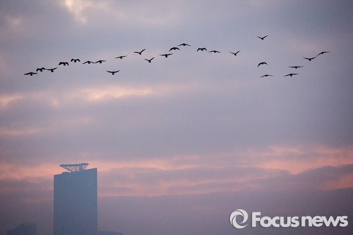 (서울=포커스뉴스) 2016 병신년(丙申年) 첫날인 1일 아침 서울 영등포구 선유도에서 떠오르는 첫 해 위로 철새가 날아가고 있다.