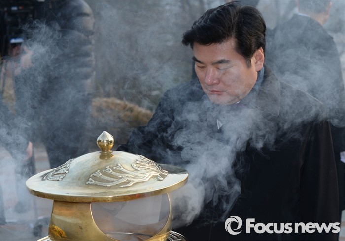 (서울=포커스뉴스) 병신년(丙申年) 새해 첫 날인 1일 오전 동작구 국립서울현충원에서 원유철 새누리당 원내대표가 김대중 전 대통령 묘역 참배를 하고 있다.