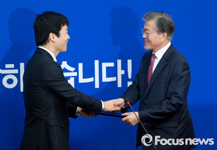 (서울=포커스뉴스) 문재인 더불어민주당 대표가 3일 오후 김병관 웹젠 이사회 의장으로부터 지역당원 입당원서를 전달 받고 있다.