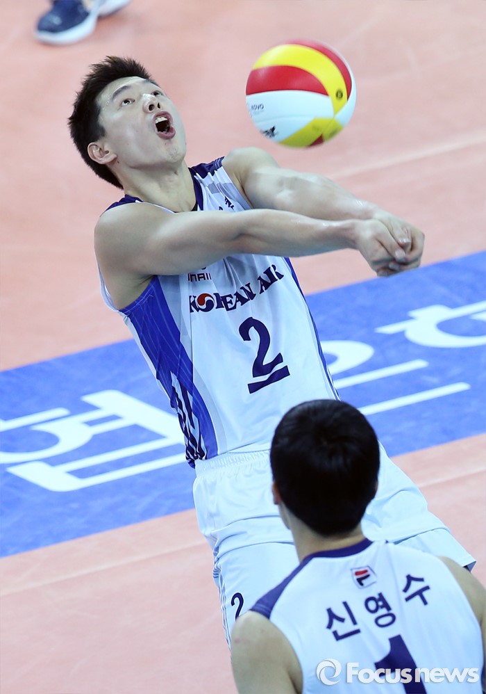 (인천=포커스뉴스) 3일 인천 계양체육관에서 열린 '2015-2016NH농협 V-리그' 남자부 대한항공-삼성화재 경기에서 대한항공 한선수가 블로킹에 맞고 튄 공을 살려내고 있다.