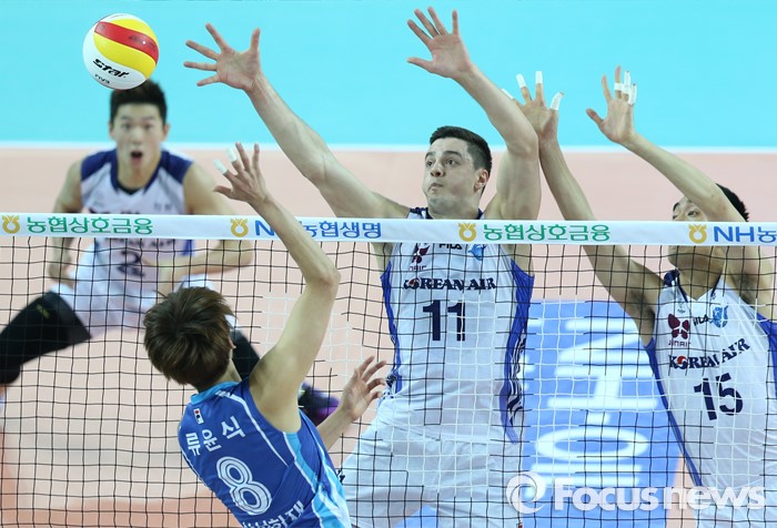 (인천=포커스뉴스) 3일 인천 계양체육관에서 열린 '2015-2016NH농협 V-리그' 남자부 대한항공-삼성화재 경기에서 삼성화재 류윤식이 대한항공 모로즈, 김형우의 블로킹을 피해 빈 공간으로 연타 공격을 하고 있다.