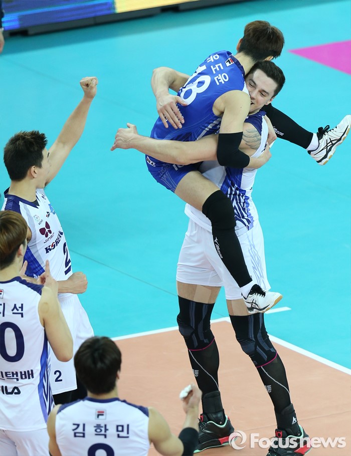 (인천=포커스뉴스) 3일 인천 계양체육관에서 열린 '2015-2016NH농협 V-리그' 남자부 대한항공-삼성화재 경기에서 대한항공 모로즈가 스파이크 서브로 득점을 올리고 동료들과 환호하고 있다.