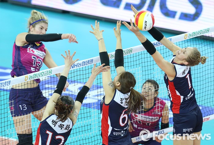 한편 이날 승리한 흥국생명은 12승 6패를 기록했고 승점 2점 추가로 32점을 기록해 이날 경기가 없었던 IBK기업은행(31점)을 3위로 끌어내리고 2위로 도약했다. KGC는 승점 1점을 추가했지만 2승 16패, 승점 8점으로 최하위를 유지했다.(인천=포커스뉴스) 3일 인천 계양체육관에서 열린 '2015-2016NH농협 V-리그' 여자부 흥국생명-KGC인삼공사 경기에서 흥국생명 테일러가 KGC인삼공사 한수지, 장영은, 헤일리의 3중 블로킹을 뚫는 스파이크를 날리고 있다. 2016.01.03 우정식 기자