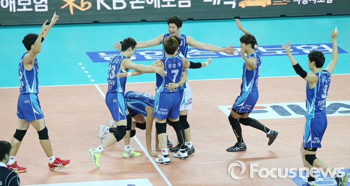 (인천=포커스뉴스) 3일 인천 계양체육관에서 열린 '2015-2016NH농협 V-리그' 남자부 대한항공-삼성화재 경기에서 1,2세트를 내준뒤 3-2로 역전승한 삼성화재 선수듣이 경기를 마치고 서로 얼싸 안으며 승리의 기쁨을 만끽하고 있다.