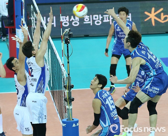 (인천=포커스뉴스) 3일 인천 계양체육관에서 열린 '2015-2016NH농협 V-리그' 남자부 대한항공-삼성화재 경기에서 삼성화재 최귀엽이 세트 스코어 3-2를 마무리 짓는 오른손 강스파이크를 날리고 있다.