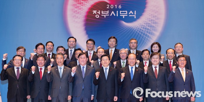 (세종=포커스뉴스) 황교안 국무총리와 각 부처 장관들이 4일 오전 세종시 정부세종청사 대강당에서 열린 2016년 정부시무식에 참석해 기념촬영을 하고 있다.