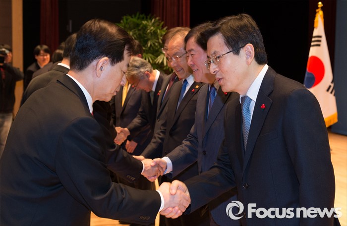 (세종=포커스뉴스) 황교안 국무총리와 각 부처 장관들이 4일 오전 세종시 정부세종청사 대강당에서 열린 2016년 정부시무식에 참석해 신년인사를 하고 있다.