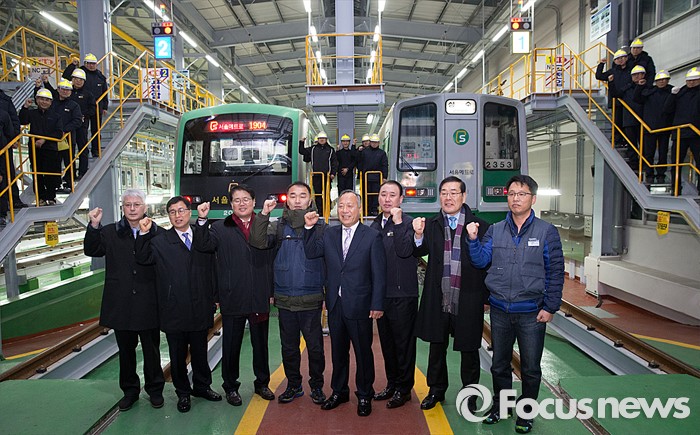 (서울=포커스뉴스) 이정원(왼쪽 다섯번쨰) 서울메트로 사장과 임직원들이 4일 오전 서울 군자차량기지에서 파이팅 구호를 외치고 있다..