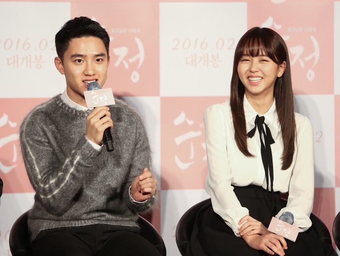 가수에서 배우로 나서는 엑소의 디오(도경수)가 4일 광진구 건대입구 롯데시네마점에서 열린 '순정' 제작보고회에서 촬영 비화를 털어놨다. 여주인공 김소현을 업는 장면이 신경쓰였다는 것이다. 도경수는 "김소현을 업는 장면이 워낙 많았다. 사람을 이렇게 많이 업어본 건 처음이었다. 소현이는 깃털같았다. 그래도 처음엔 '조금' 힘들더라"고 장난기가 잔뜩 묻어난 말을 쏟아냈다.