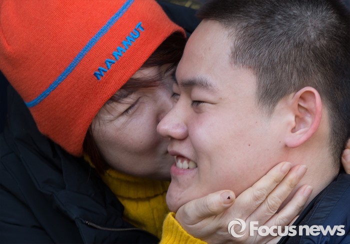 (논산=포커스뉴스) 4일 오후 충남 논산 육군훈련소 입영심사대에서 입영장병의 어머니가 뽀뽀를 하며 인사를 하고 있다.
