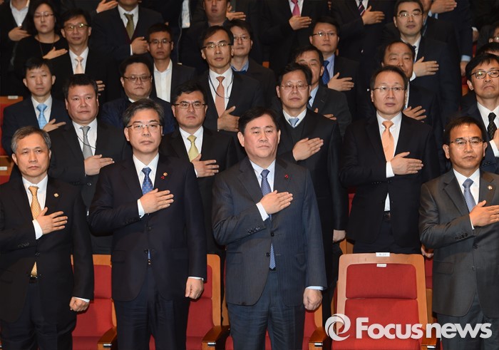 (세종=포커스뉴스) 최경환 경제부총리 겸 기획재정부장관이 4일 오전 세종시 정부세종청사 대강당에서 열린 기재부 시무식에 참석해 국기에 대한 경례를 하고 있다. <사진제공=기획재정부>