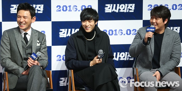(서울=포커스뉴스) 4일 오후 서울 강남구 압구정 CGV에서 열린 영화 '검사외전' 제작보고회에 참석한 배우 황정민(왼쪽부터), 강동원과 이일형 감독이 환한 미소를 짓고 있다.