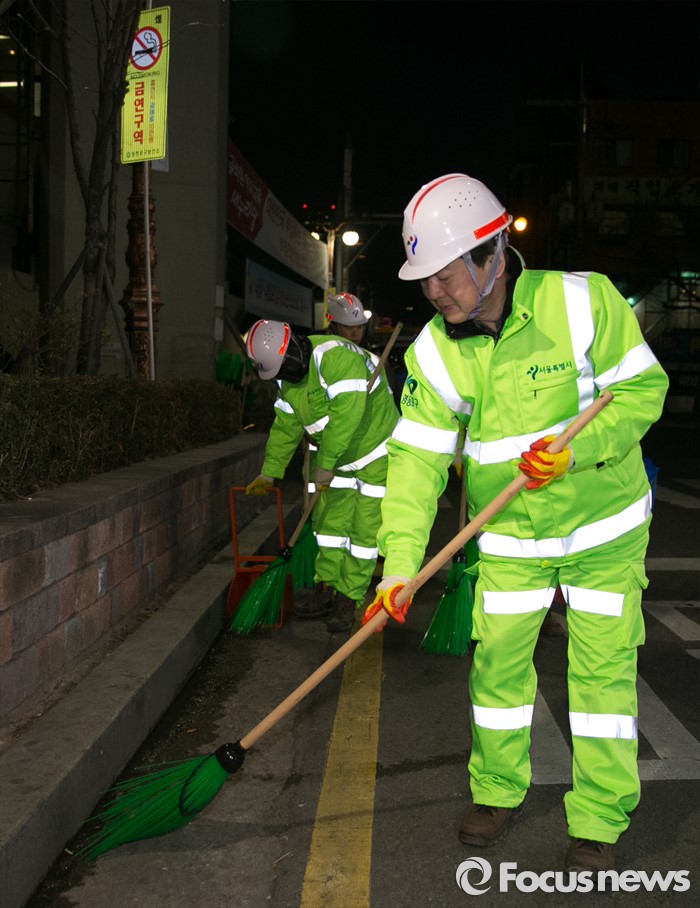 (서울=포커스뉴스) 신당 창당을 추진 중인 안철수 무소속 의원이 5일 오전 서울 영등포역 동부광장 인근에서 환경미화원들과 함께 새해맞이 청소를 하고 있다.