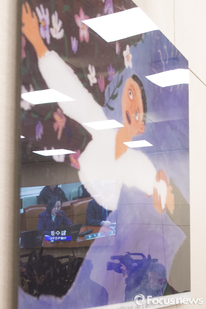 (서울=포커스뉴스) 5일 오전 서울 여의도 국회에서 열린 여성가족위원회 전체회의 모습이 故 김순덕 위안부 피해 할머니 유작 '끌려감'에 반사되어 보이고 있다. 이날 여가위는 한일 위안부 합의와 관련해, 여성가족부의 현안보고를 들으려 했으나, 여야 간사간협의가 이루어지지 않은 점을 들어 여당 의원과 김희정 장관은 참석하지 않았다.