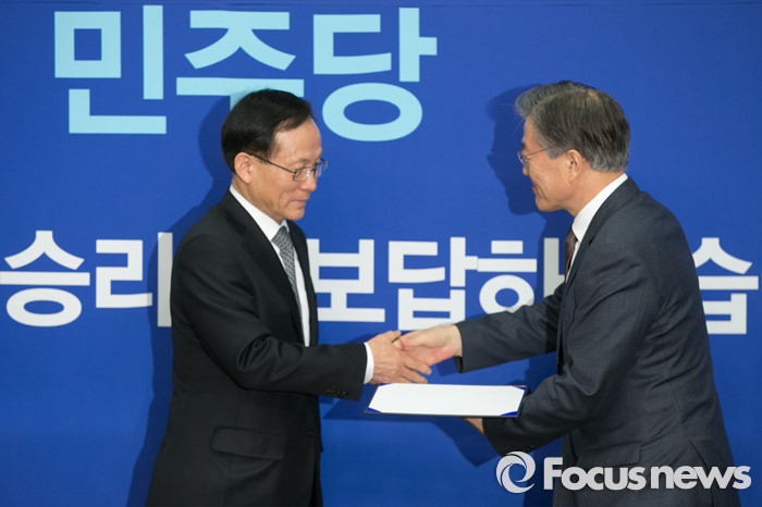 (서울=포커스뉴스) 문재인(오른쪽) 더불어민주당 대표가 5일 오전 서울 여의도 국회에서 이수혁 전 6자회담 수석대표의 입당원서를 전달받은 뒤 악수하고 있다.