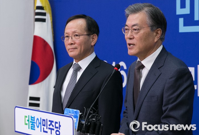 (서울=포커스뉴스) 문재인(오른쪽) 더불어민주당 대표가 5일 오전 서울 여의도 국회에서 이수혁 전 6자회담 수석대표의 입당식에 참석해 인사말을 하고 있다.