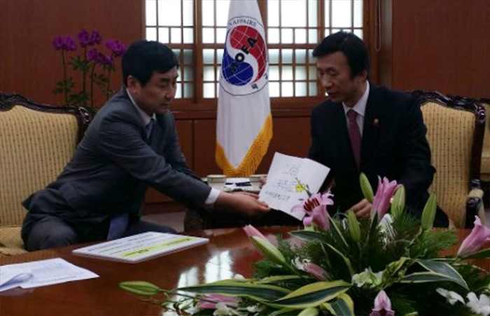(서울=포커스뉴스) 이종걸(왼쪽) 더불어민주당 원내대표가 5일 오후 서울 종로구 정부서울청사 외교부를 한일 위안부 합의와 관련 항의 방문해 윤병세 장관과 대화하고 있다. <사진제공=더불어민주당>