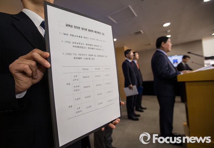 (서울=포커스뉴스) 최경환 부총리겸 기획재정부장관이 5일 오후 종로구 서울정부청사에서 누리과정 관련 긴급 관계부처 합동브리핑을 하고있는 가운데 기자들에게 2016년 지방교육재정표를 보여주고 있다.