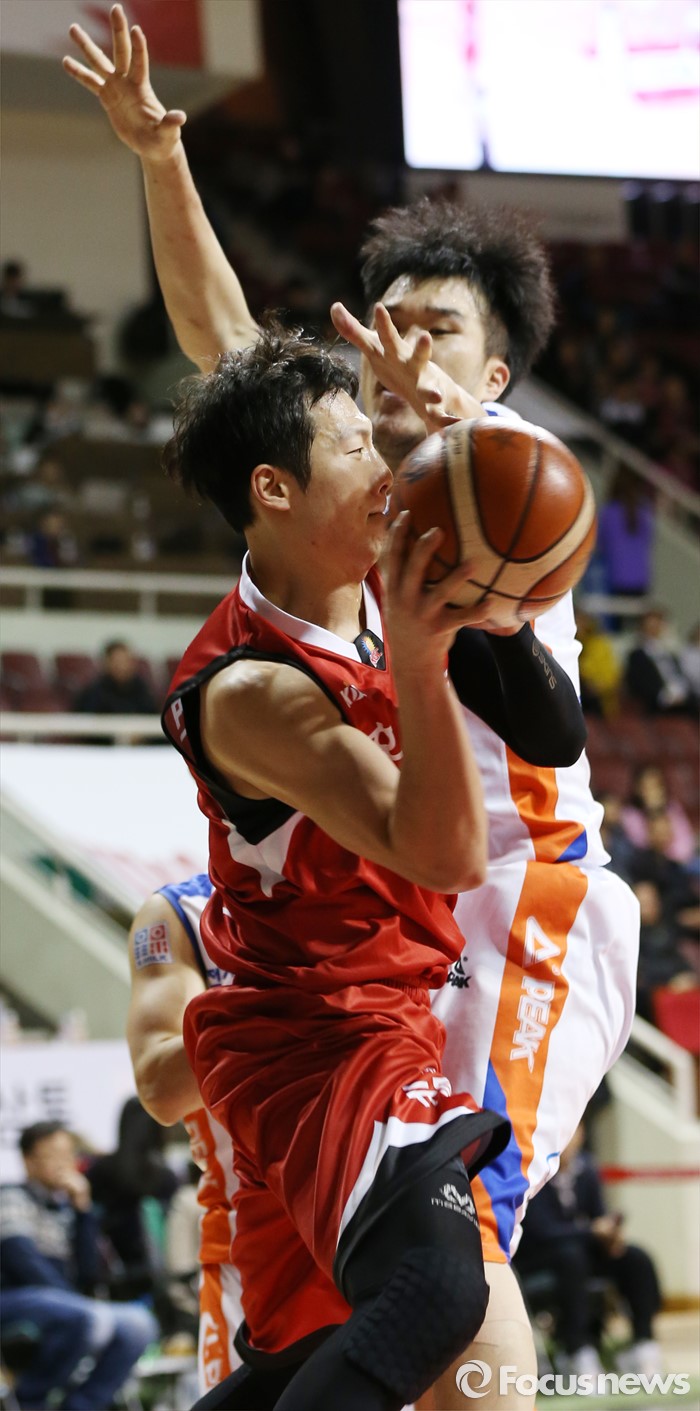 (안양=포커스뉴스) 5일 안양실내체육관에서 열린 2015-2016 프로농구 KGC-전자랜드 경기에서 KGC 이정현이 전자랜드 주태수의 마크를 받으며 패스를 시도하고 있다.