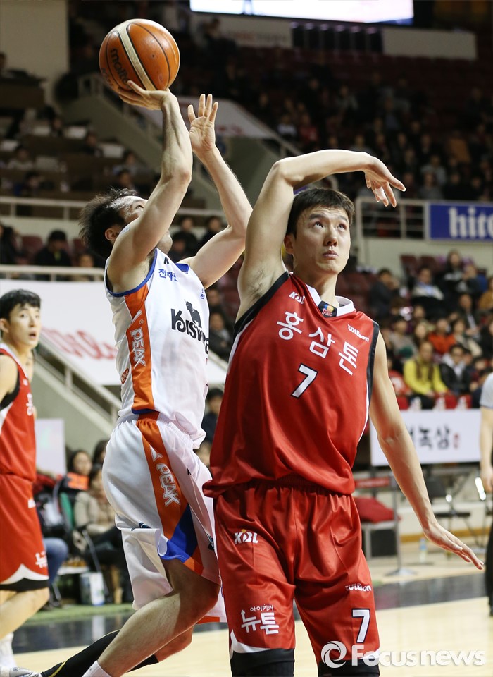 (안양=포커스뉴스) 5일 안양실내체육관에서 열린 2015-2016 프로농구 KGC-전자랜드 경기에서 전자랜드 박성진의 슈팅을 KGC 박찬희가 마크하다 파울을 피하기 위해 돌아서 있다.