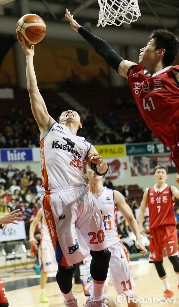 (안양=포커스뉴스) 5일 안양실내체육관에서 열린 2015-2016 프로농구 KGC-전자랜드 경기에서 전자랜드 정영삼이 KGC 오세근의 마크를 받으며 레이업숫을 시도하고 있다.