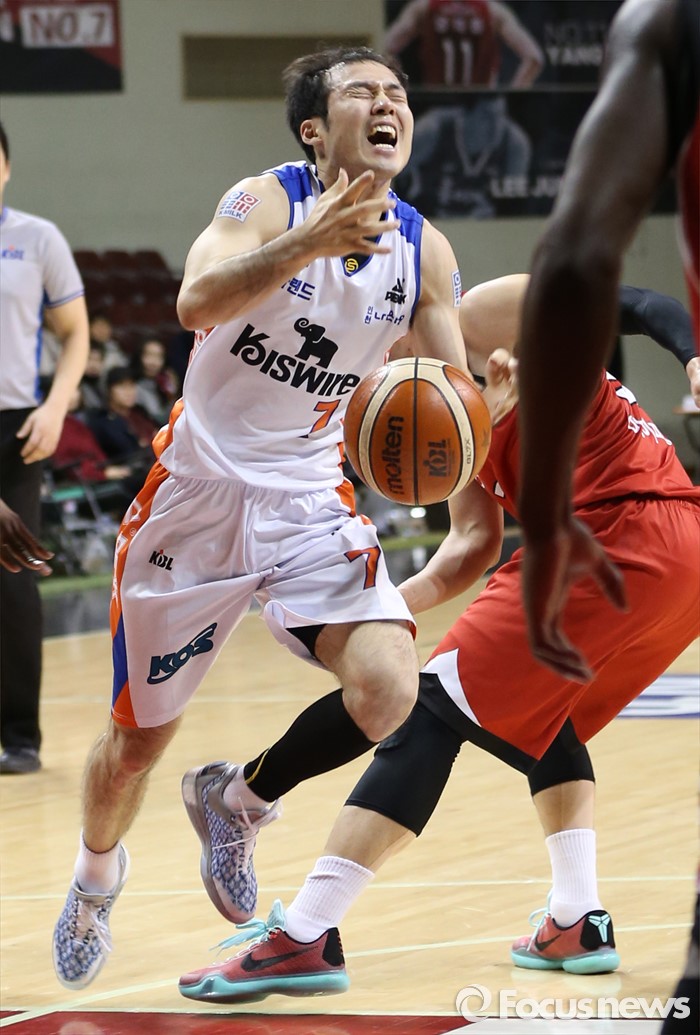 (안양=포커스뉴스) 5일 안양실내체육관에서 열린 2015-2016 프로농구 KGC-전자랜드 경기에서 전자랜드 박성진이 돌파를 시도하다 KGC 이정현의 파울에 볼을 놓치고 있다.