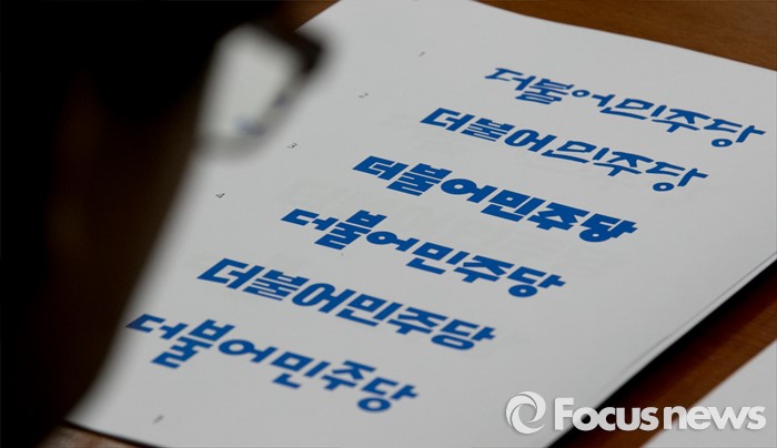 (서울=포커스뉴스) 6일 오전 서울 여의도 국회에서 열린 더불어민주당 최고위원회의에 참석한 한 당직자가 당명 로고 관련 시안을 살펴보고 있다.