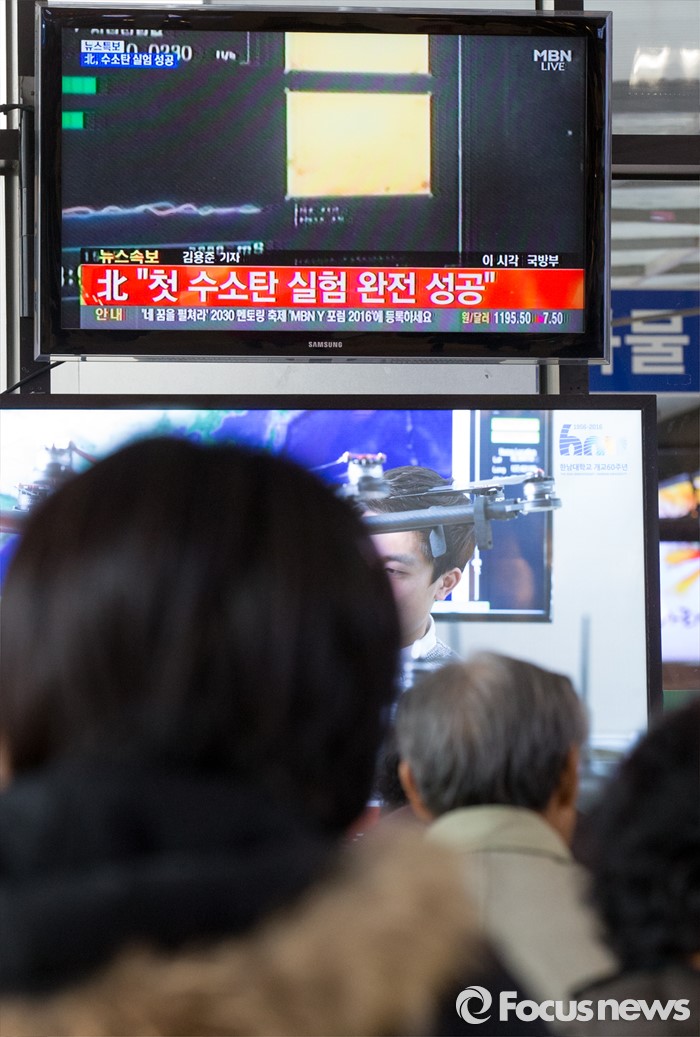 (서울=포커스뉴스) 북한이 첫 수소탄 핵실험을 실시했다고 발표한 6일 오후 서울 서초구 고속버스터미널에서 시민들이 이에 관련된 뉴스특보를 시청하고 있다.