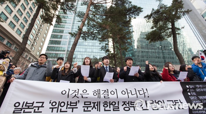 (서울=포커스뉴스) 6일 오전 서울 종로구 구 일본대사관 앞에서 대학생 대표자들이 일본군 위안부 문제 한일 정부간 합의 규탄 시국선언을 하고 있다.