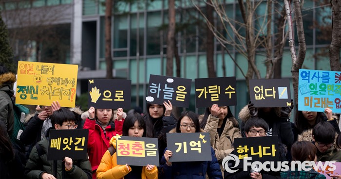 (서울=포커스뉴스) 일본군 위안부 문제해결을 위한 정기수요집회가 제1212차로 24주년을 맞은 6일 오후 서울 종로구 구 일본대사관 앞에서 참가자들이 손피켓을 들고 있다.