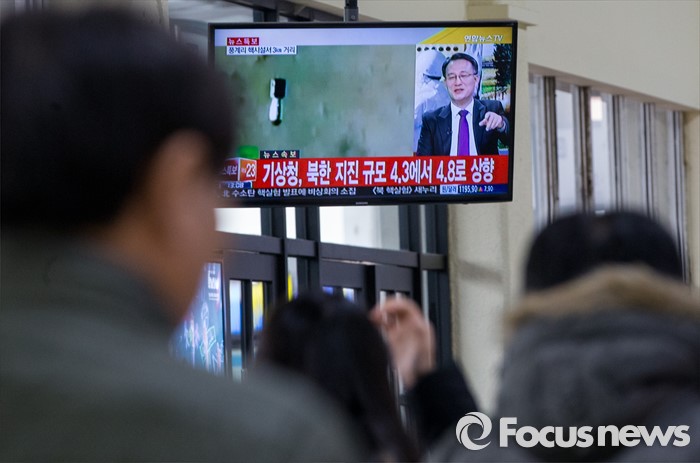 (서울=포커스뉴스) 북한이 첫 수소탄 핵실험을 실시했다고 발표한 6일 오후 서울 서초구 고속버스터미널에서 시민들이 이에 관련된 뉴스특보를 시청하고 있다.