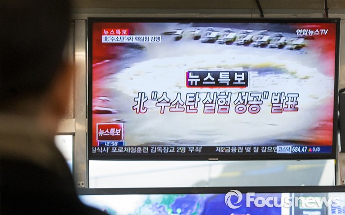 이에 대해 한국은행은 오후 2시 장병화 부총재를 반장으로 한 '통화금융대책반 회의'를 열고 북한 인공지진 소식 후 급등한 원‧달러 환율 추이 및 주식시장 동향 등에 대한 대응방안을 논의한다.(서울=포커스뉴스) 북한이 첫 수소탄 핵실험을 실시했다고 발표한 6일 오후 서울 서초구 고속버스터미널에서 시민들이 이에 관련된 뉴스특보를 시청하고 있다. 2016.01.06 양지웅 기자