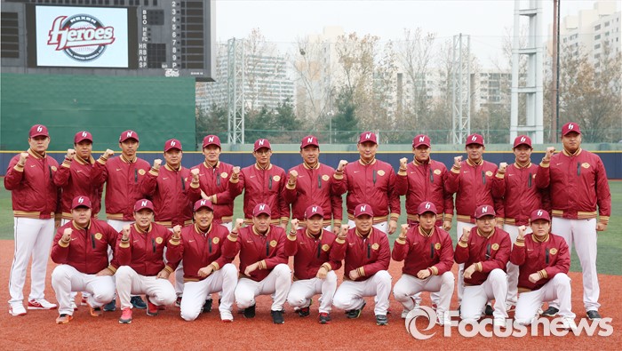 (서울=포커스뉴스) 6일 목동구장에서 열린 프로야구 2016년 넥센 히어로즈 시무식을 마치고 염경엽 감독을 비롯한 코칭스탭이 그라운드에 모여 새해의 선전을 다짐하고 있다.