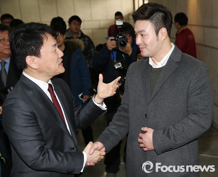 (서울=포커스뉴스) 미국 메이저리그 미네소타 트윈스에 진출한 박병호(오른쪽)가 6일 목동구장에서 열린 프로야구 2016년 넥센 히어로즈 시무식에 참석해 이장석 대표와 악수하고 있다.