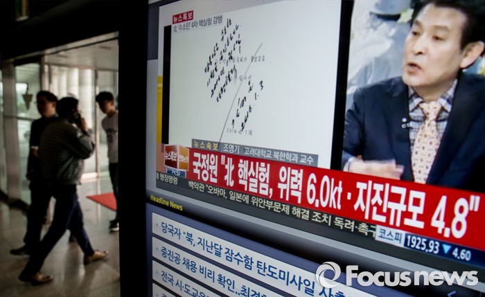 (서울=포커스뉴스) 북한이 수소폭탄 실험에 성공했다고 주장하고 있는 6일 오후 서울 국방부에 설치된 TV에 관련 뉴스가 보도되고 있다.