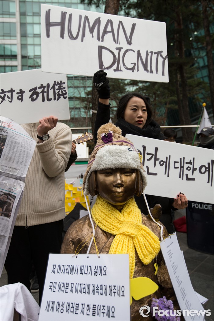 (서울=포커스뉴스) 6일 오후 서울 종로구 위안부 소녀상 앞에서 올해로 24주년을 맞은 일본군 위안부 문제 해결을 위한 1212차 수요 시위가 끝난 후 예술인 참석자들이 피켓을 들고 퍼포먼스를 하고 있다.