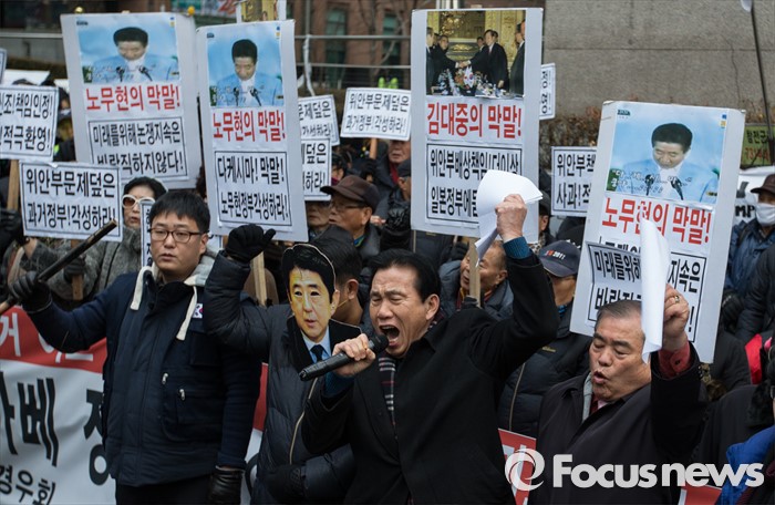 (서울=포커스뉴스) 6일 오후 서울 종로구 위안부 소녀상 앞에서 올해로 24주년을 맞은 일본군 위안부 문제 해결을 위한 1212차 수요 시위가 끝난 직후 어버이연합 회원들이 아베 정권을 규탄하는 집회를 하고 있다.