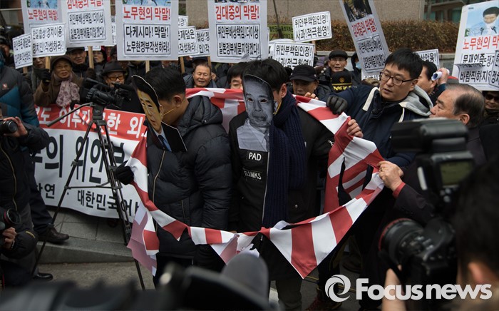 (서울=포커스뉴스) 6일 오후 서울 종로구 위안부 소녀상 앞에서 올해로 24주년을 맞은 일본군 위안부 문제 해결을 위한 1212차 수요 시위가 열린 직후 어버이연합 회원들이 욱일승천기를 찢고 있다.