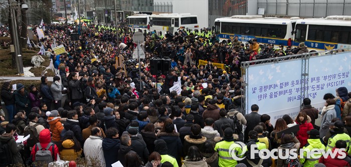 (서울=포커스뉴스) 6일 오후 서울 종로구 위안부 소녀상 앞에서 올해로 24주년을 맞은 일본군 위안부 문제 해결을 위한 1212차 수요 시위가 열리고 있다.
