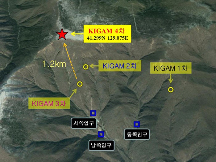 (서울=포커스뉴스) 북한이 4차 핵실험을 감행한 6일 오후 대전 유성구 한국지질자원연구원에서 공개한 북 핵실험 장소. <사진제공=지진연구센터>