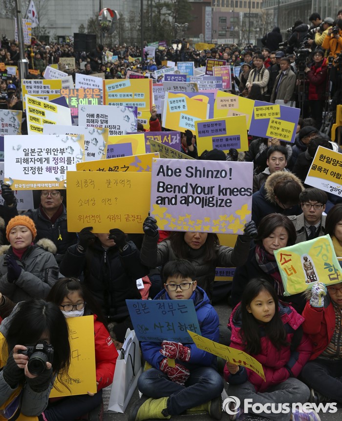 (서울=포커스뉴스) 일본군 위안부 문제 해결을 위한 정기 수요집회 24주년인 6일 오후 서울 종로구 주한일본대사관 앞에서 제1212차 수요집회가 열리고 있다.