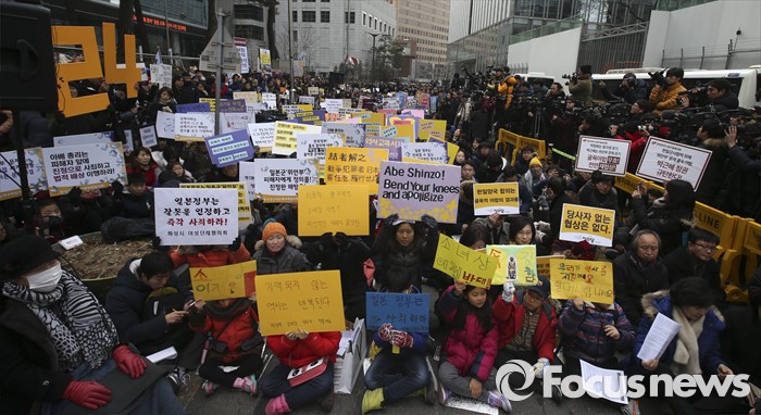 (서울=포커스뉴스) 일본군 위안부 문제 해결을 위한 정기 수요집회 24주년인 6일 오후 서울 종로구 주한일본대사관 앞에서 제1212차 수요집회가 열리고 있다.