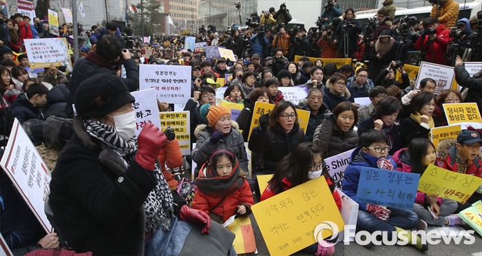 (서울=포커스뉴스) 6일 서울 종로구 옛 일본대사관 앞에서 열린 제1212차 정기수요집회에서 이용수 할머니와 참석자들이 구호를 외치고 있다. 단일 주제로 벌이는 세계 최장기 집회로 알려진 정기수요집회는 1992년 1월 8일 시작해 금일로 24주년을 맞이했다.