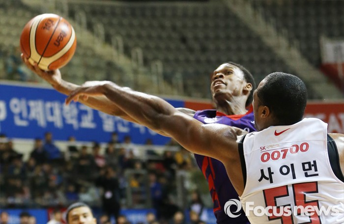 (고양=포커스뉴스) 6일 고양체육관에서 열린 2015-2016 프로농구 오리온-SK 경기에서 오리온 이승현과 SK 사이먼이 리바운드볼을 다투고 있다.