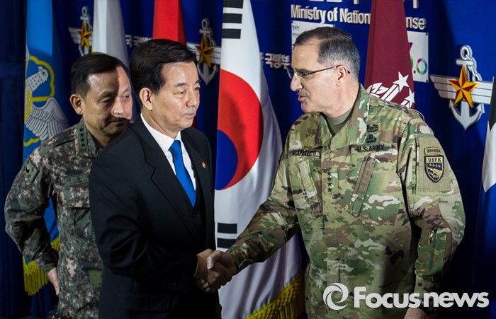 (서울=포커스뉴스) 한민구 국방부 장관과 커티스 스캐퍼로티 주한미군사령관이 7일 오전 서울 용산구 국방부에서 북한 수소탄 실험에 대한 한미 양국 공조 방안을 발표한 뒤 악수 하고 있다.