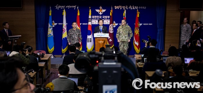 (서울=포커스뉴스) 한민구 국방부 장관이 7일 오전 서울 용산구 국방부에서 북한 수소탄 실험에 대한 한미 양국 공조 방안을 발표하고 있다. 한 장관 왼쪽은 커티스 스캐퍼로티 주한미군사령관, 오른쪽은 이순진 합참의장.