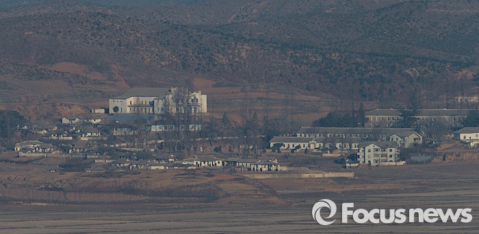 (파주=포커스뉴스) 7일 오전 경기도 파주 오두산 통일전망대에서 북한 황해북도 개풍군 인민문화회관(왼쪽)과 림한소학교(오른쪽)가 관측되고 있다.