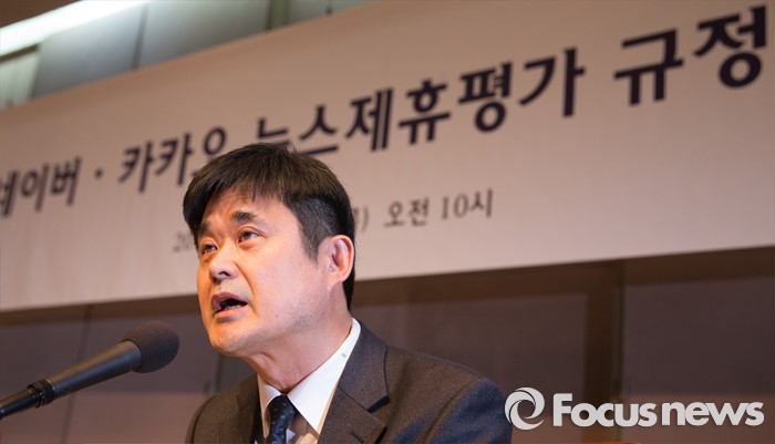 (서울=포커스뉴스) 인터넷 포털 네이버와 카카오의 뉴스 제휴 심사를 담당할 '뉴스제휴평가위원회'가 7일 오전 서울 중구 프레스센터에서 '네이버-카카오 뉴스 제휴 및 제재 심사 규정'을 발표하는 기자간담회를 진행하고 있다. 김병희 제 2 소위원장이 세부 규정에 대해 발표하고 있다.